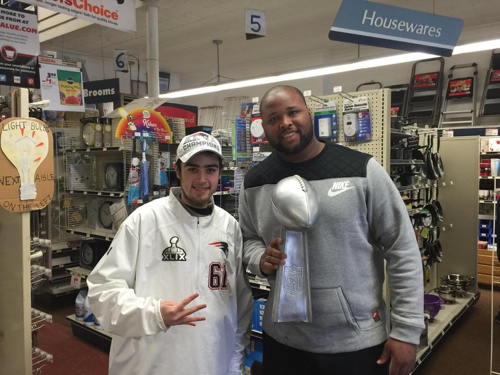 El chico de la foto es un fan de los New England Patriots, y le dio a Cannon una réplica del trofeo Vince Lombardi. A cambio, él hizo una visita sorpresa a la ferretería en donde trabajaba este muchacho, y le llevó el premio original para mostrárselo y una chaqueta de los Patriots como obsequio.
