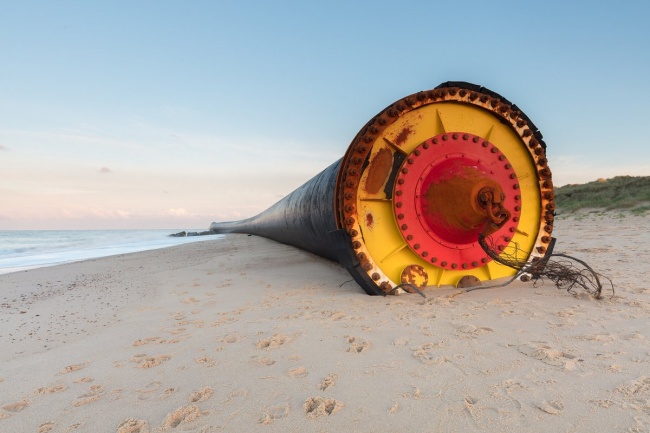 Los enormes tubos con 2 metros de diámetro cayeron en el mar durante su transporte y, para gran sorpresa de los habitantes de Norfolk, fueron expulsados por el mar a la orilla en agosto de 2017. El tubo más largo medía 500 m.