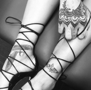Internet prácticamente explotó cuando Rihanna presentó su nuevo tatuaje en forma de tiburón con un diseño de camuflaje. Poco después, el rapero canadiense Drake, con quien la cantante estaba saliendo en ese momento, fue visto con una imagen similar en su antebrazo.