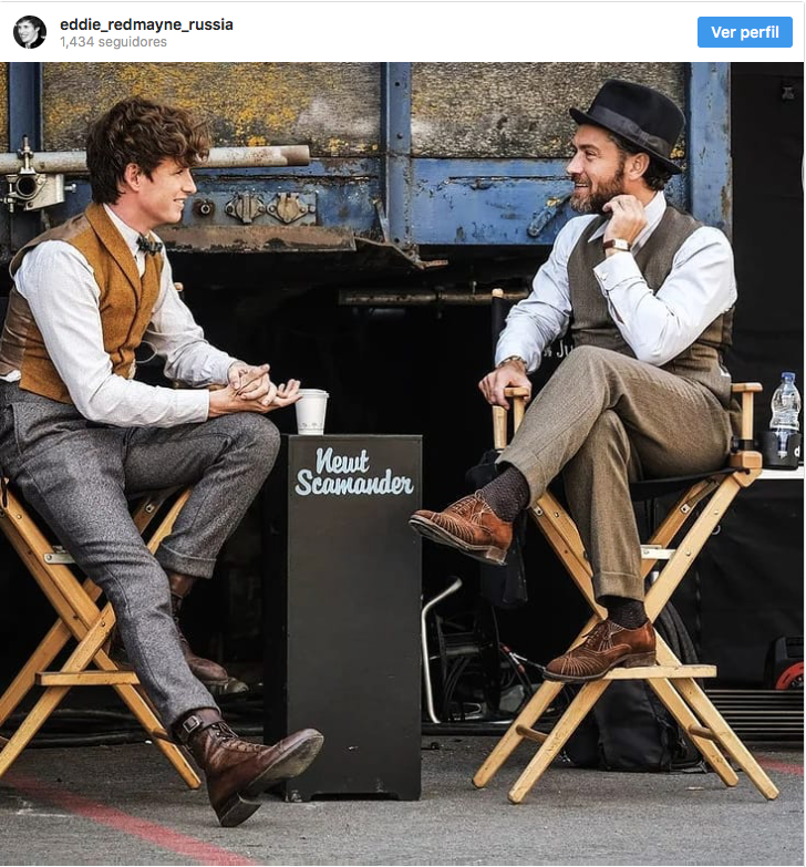 Eddie Redmayne (Newt Scamander) y Jude Law (Albus Dumbledore) en un receso del rodaje de la película “Animales Fantásticos: Los Crímenes de Grindelwald”.