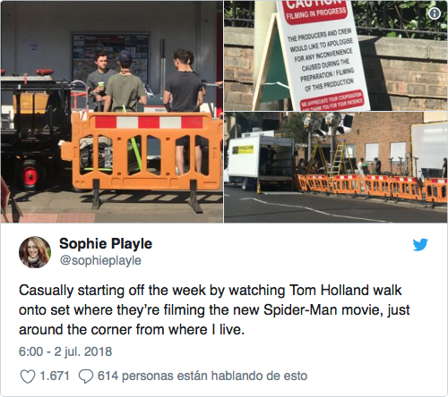 El 2 de julio, una residente del condado inglés Hertfordshire, Sophie Playle, con sorpresa descubrió que cerca de su casa comenzaron a rodar la película del Hombre araña. Ella tomó un par de fotografías con su teléfono, escribió una publicación en Twitter y se sorprendió increíblemente cuando sus tomas se extendieron no solo en las redes sociales, sino también en páginas web famosas.
