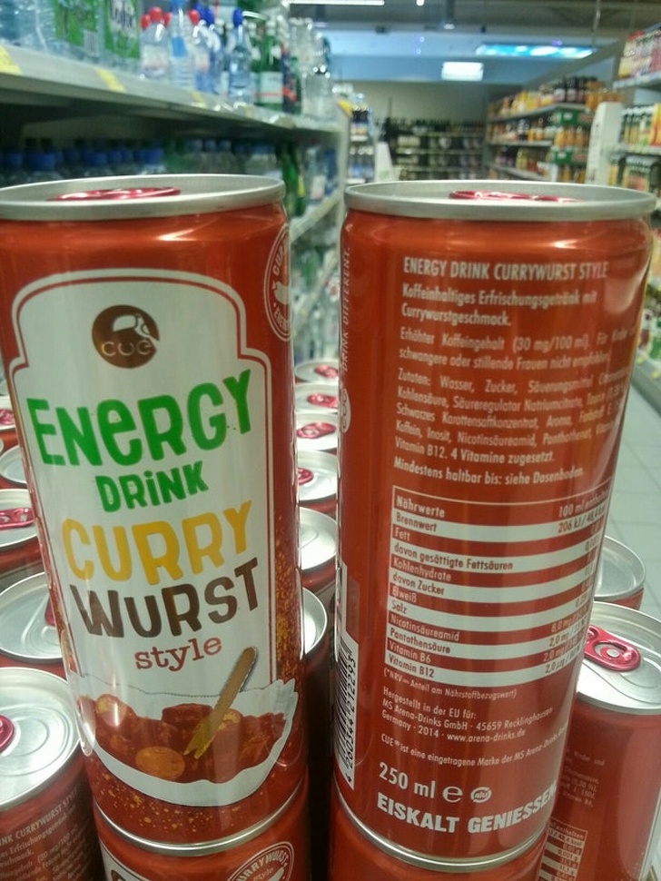 Bebida energética con sabor a salchichas y salsa de curry.