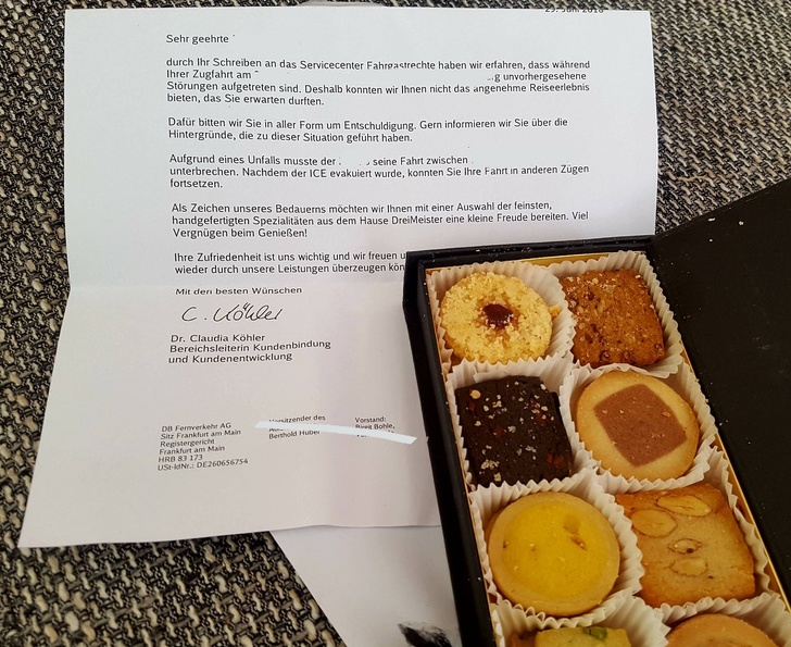 No es un estereotipo, sino un rasgo de carácter alemán real. A los alemanes en realidad no les gusta llegar tarde y están terriblemente preocupados cuando alguien los está esperando. Sin embargo, esto no siempre concierne al trabajo del transporte público. Uno de los usuarios de la red social compartióla carta de disculpas que recibió junto con las galletas y la compensación monetaria enviada por la dirección del ferrocarril alemán por el retraso de 4 horas de su tren.