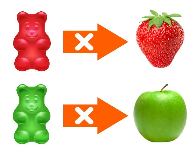 Verdad: La composición de estos dulces gelatinosos incluye azúcar, almidón y colorantes alimentarios, pero no fruta. Otro engaño está en que los osos verdes pueden no tener el sabor de manzana y sí de fresa.