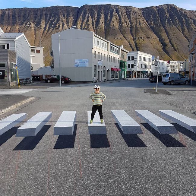 Em Ísafjörður, Islândia, decidiram fazer uma marcação mais efetiva para os pedestres atravessarem. Os pintores fizeram faixas de pedestres em 3D, que à primeira vista, parecem estar suspensas no ar.