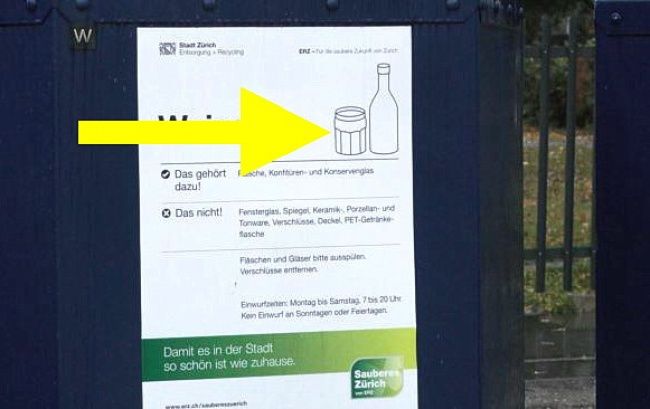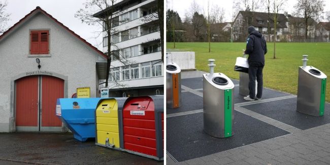 A Suíça é um país bem avançado em termos de reciclagem. Em Zurique, maior cidade da Suíça, 43% do lixo é reciclado. Para a coleta de papelão, metal e vidro, há recipientes em praticamente todos os lugares. O resto do lixo é jogado em sacos brancos por 1,5 euros, e todos se preocupam em separar essas sacolas minuciosamente. O lixo é queimado e a energia obtida é usada para o aquecimento de 170 mil casas.