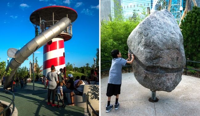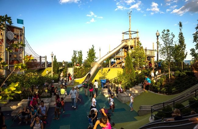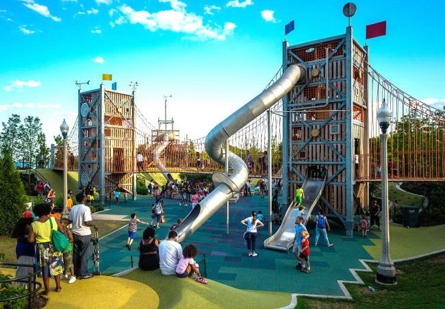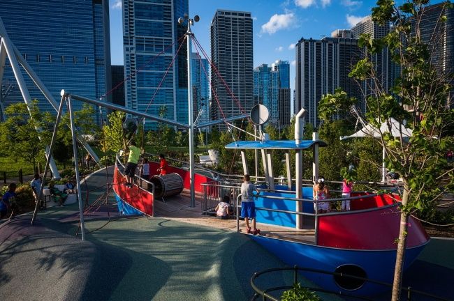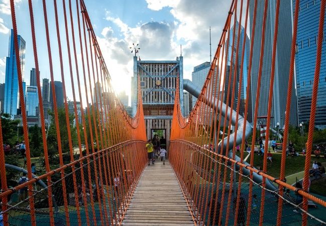 Esse parque de Chicago com certeza é diferente de todos que já vimos. No local há a simulação de um “porto”, com torres de faróis e baleias. Em todo lugar há paredes para escalar e simulação de colinas e ondas.