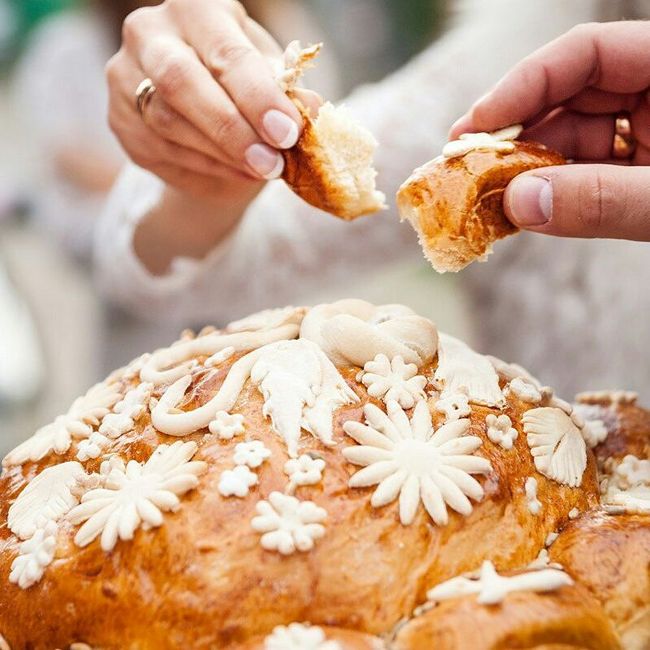 Em festas de casamento na Rússia, os noivos recebem pão e sal dos pais da noiva, simbolizando saúde, prosperidade e vida longa. Tanto a noiva quanto o noivo partem um pedaço de pão, colocam sal sobre ele e se alimentam. Depois disso, todos os convidados recebem um pedaço do pão de casamento chamado karavai.
