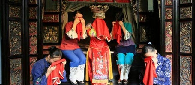 As noivas do grupo étnico Tujia, na China, devem chorar por uma hora todos os dias durante um mês antes do casamento e na cerimônia em si. Dez dias depois que a noiva começa a chorar, sua mãe se junta a ela e faz o mesmo, e dez dias depois, sua avó junta-se também. Até o final do mês, todas as mulheres da família estão chorando ao lado da noiva. Esse costume simboliza felicidade.