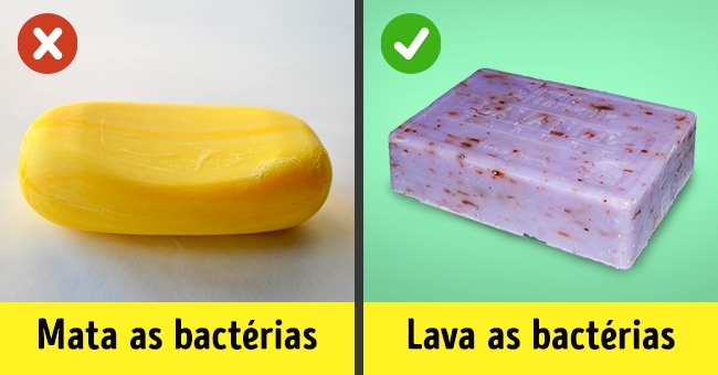 Na realidade: o sabão apenas lava as bactérias, sem eliminá-las. Mas lavar as mãos com sabão elimina a oleosidade das mãos, responsável por criar um ambiente perfeito para a reprodução de bactérias.
