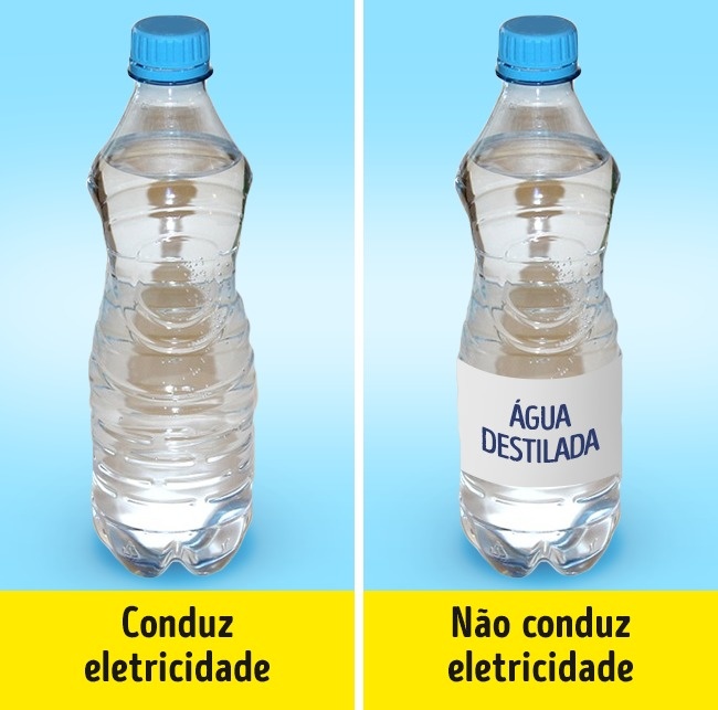 Na realidade: não é a água, e sim os minerais dissolvidos, carregados de partículas positivas e negativas, que conduzem a eletricidade. Portanto, a água destilada, por não conter minerais, não conduz eletricidade.