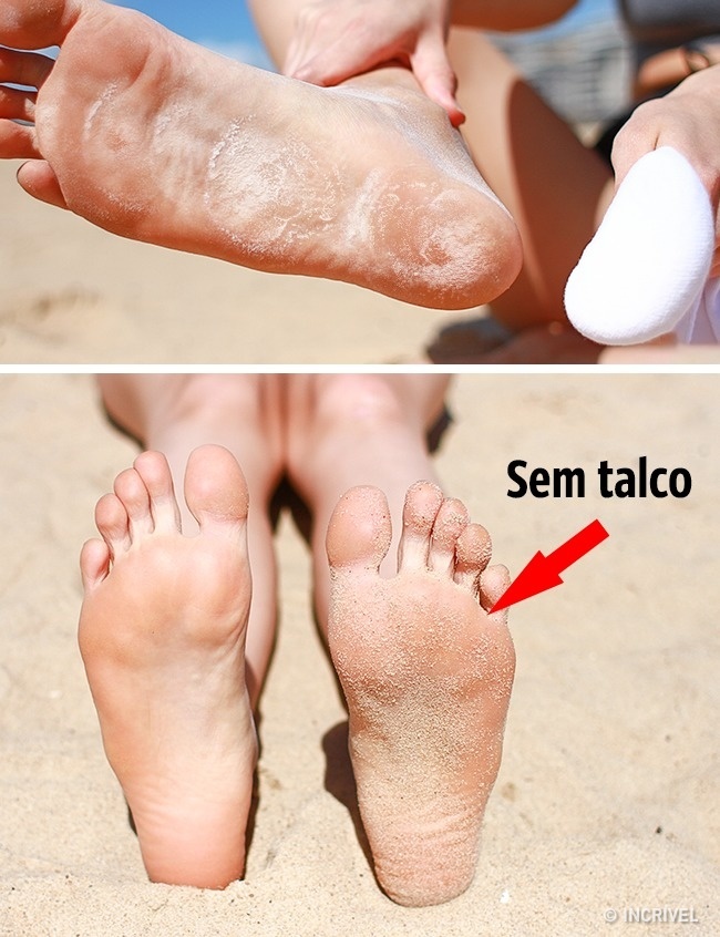 Por conta da areia grudada nos pés, pode ser difícil calçar sapatos logo após sair da praia. Para evitar o problema, use talco para bebê.