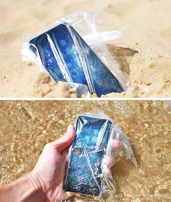 O que fazer. Para proteger seu celular contra a areia e a umidade, coloque-o numa sacola com fecho hermético e use um canudo para tirar o ar de dentro dela. Assim, você terá um protetor à prova d’água que pode ser feito em segundos.
