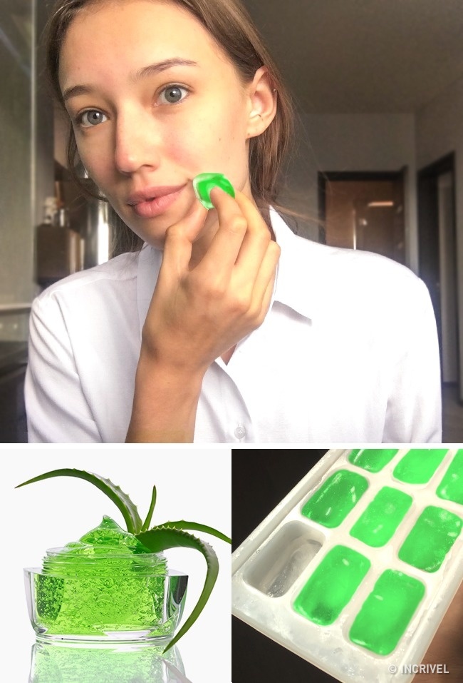 O que fazer. Compre um gel natural com aloe ou retire o sumo diretamente das folhas, congelando-o em forminhas de gelo. Use os cubinhos para aplicar no rosto, mãos ou costas em caso de queimadura. Isso diminuirá a dor e a irritação na pele, recuperando o tecido mais rapidamente.
