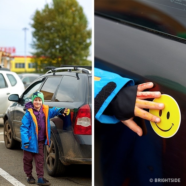 To prevent your hyperactive kids from running around the parking lot while you’re busy unloading shopping bags or younger children, offer a fun game. Place a bright sticker on your car, and tell your child he’s a transformer robot who needs to recharge his batteries at this time.