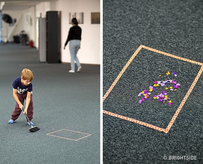 Your child will gladly do the sweeping if you turn the whole process into a game. Use some colorful Scotch tape to make a square on the floor, and tell him that his special mission is to score a goal.