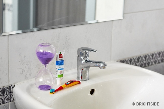 It’s difficult for children, and sometimes even for grown-ups, to know if they’ve spent enough time brushing their teeth. An hourglass, set for 2-3 minutes, is a perfect solution for you and your child. Another smart idea is to find a children’s song that lasts for at least 2 minutes, and turn it on every time your kid brushes their teeth.