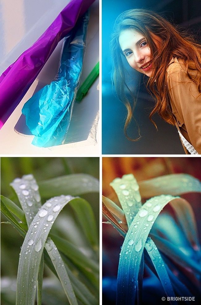 Tudo que você precisa é de um pedacinho de papel celofane perto da lente para criar esse efeito único, ou colocá-lo na frente da lente para colorir toda a imagem.