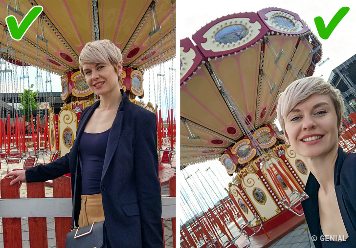 Vamos a tomar como referencia nuestro ejemplo. Tenemos un bonito carrusel y una modelo no menos bella que este, ¿cómo lo combinamos? Es posible, simplemente, poniéndose al lado de la atracción y tomar la foto, o bien se puede hacer una selfie cambiando el ángulo: así obtendremos una imagen traviesa y divertida. Así, podremos ver tanto el techo redondo del carrusel, como el columpio, y añadiremos a la imagen una fuerte carga de vivacidad. No temas experimentar con el ángulo de inclinación cuando esto sea apropiado.