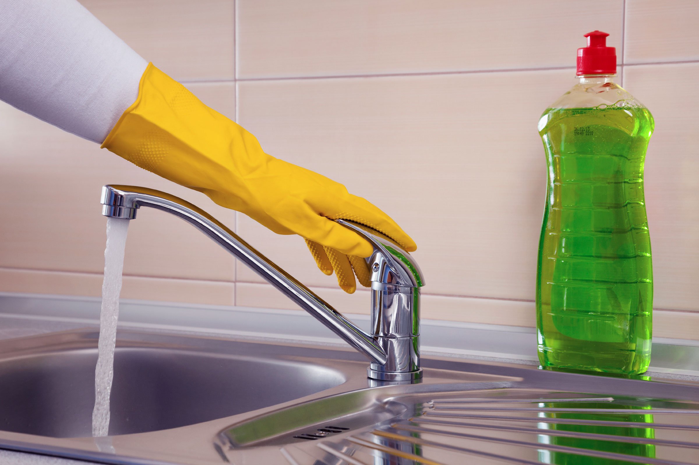 A powdered product called Bar Keepers Friend. We use it on everything. Its active ingredient is rhubarb powder, which really cuts through grit and grime. It cleans glass-top stoves, counters, toilets, porcelain, and more. Your sink will never be shinier.
