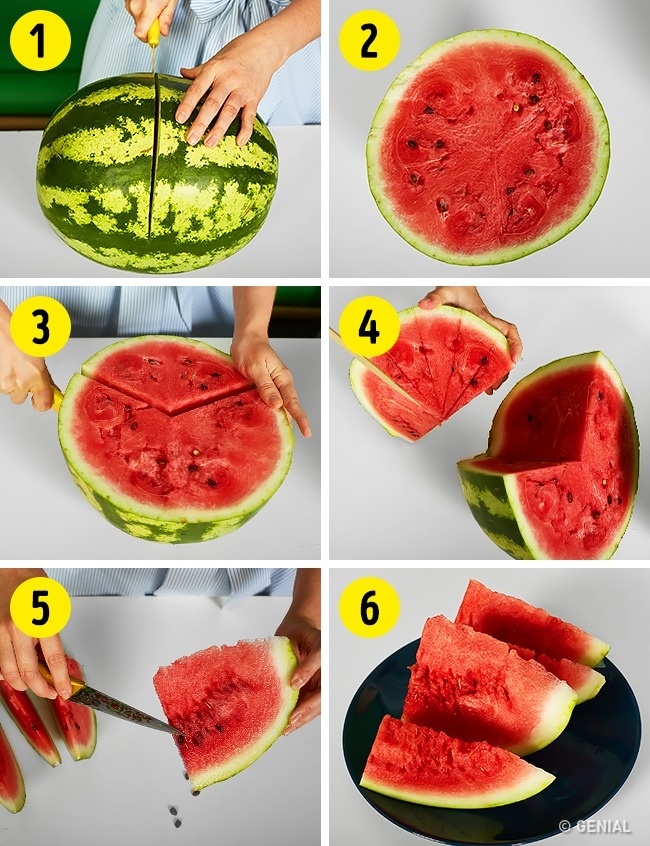 Aquí también, todo es muy simple: en primer lugar, corta la sandía por la mitad a lo ancho. Verás que las semillas crecen en fila. Debes cortar en rodajas de tal manera que las semillas se queden casi en el exterior. Así, sólo tienes que raspar suavemente con un cuchillo y desaparecerán.