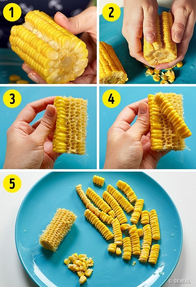 El método es simple y elegante: primero corta la mazorca de maíz hervido en unas pocas piezas pequeñas. A continuación, elimina una fila de granos, agarra la mazorca con tus manos, coloca el pulgar en la siguiente fila vacía y presiona. Así es como tú puedes comer el maíz, fila por fila, dejando su mazorca absolutamente limpia.