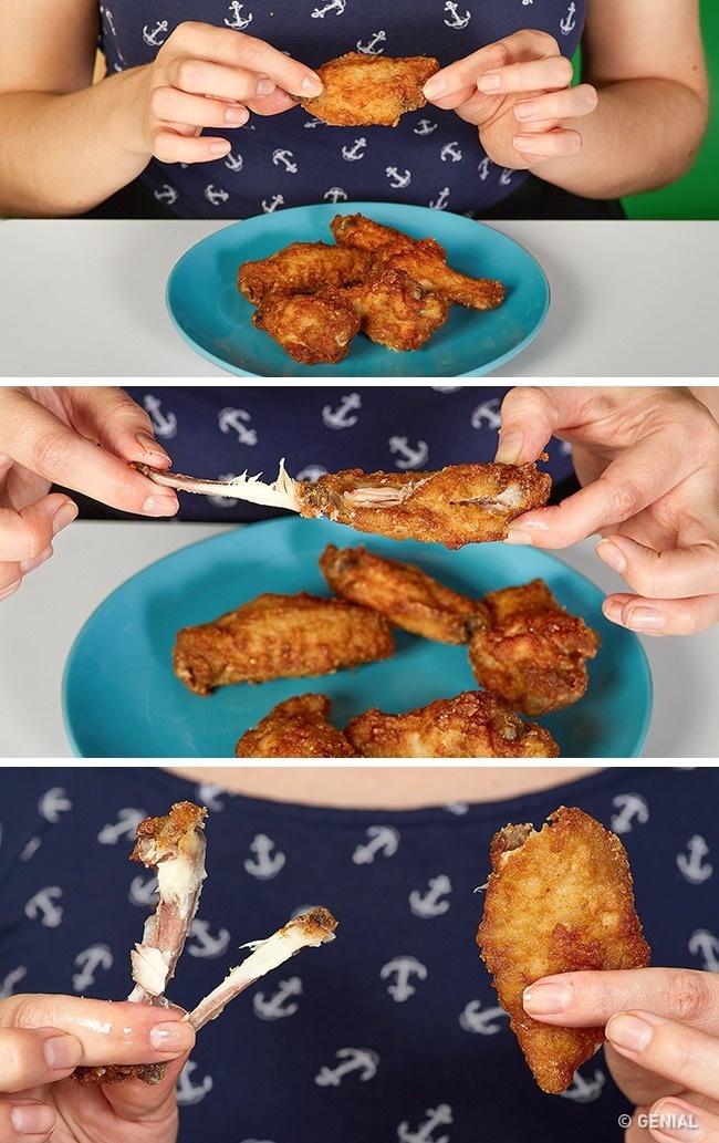 Comer alitas de pollo y no ensuciarte todo es posible siguiendo las siguientes instrucciones: Rompe una pequeña pieza del ala donde se ve el pequeño hueso. Tuércelo un poco y tira de él, saldrá fácilmente. A continuación, gira de nuevo, y extrae el hueso grande. ¡Eso es todo! ¡Disfruta!