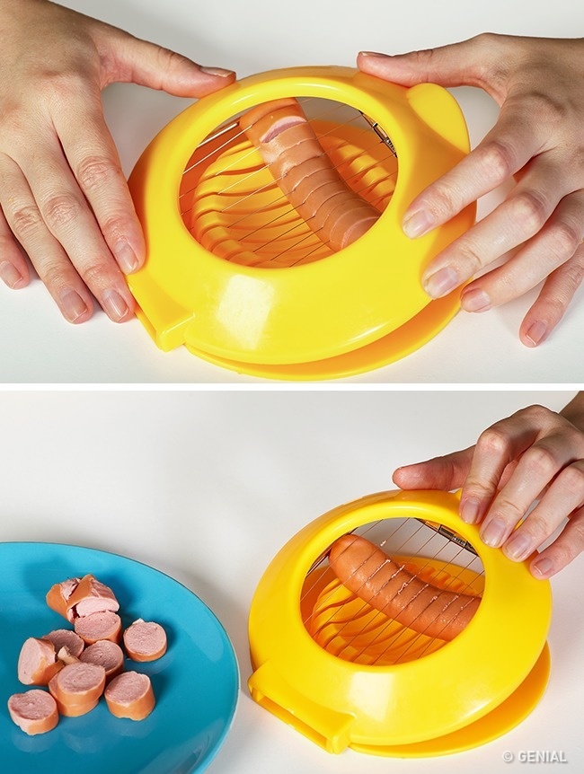 Con la ayuda de un cortador para huevos puedes desmoronar, no sólo los huevos, sino también, por ejemplo, salchichas: una gran opción para aquellos que siempre tienen prisa.