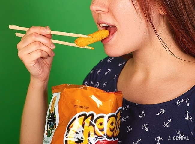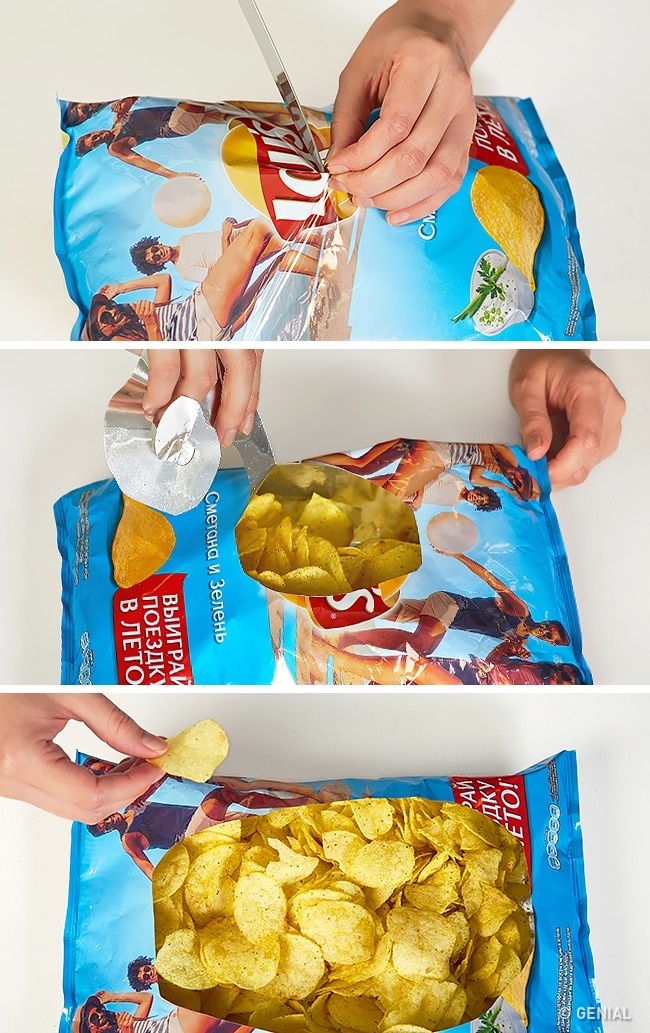Estamos acostumbrados a abrir un paquete de papas fritas por la parte superior, pero no es conveniente si las vamos a disfrutar en compañía. Con el fin de no ensuciar los platos, se puede hacer un agujero justo en el centro de la bolsa.