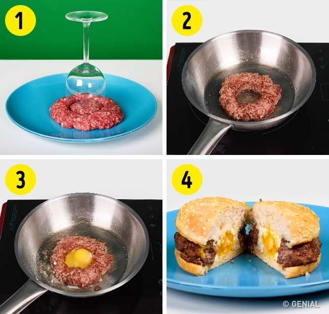 Las más deliciosas hamburguesas se obtienen añadiendo en el centro algunos ingredientes, como, por ejemplo, un huevo. Pon un poco de carne picada en forma de rosquilla sobre la sartén, deposita un huevo en el centro y fríelo por ambos lados. Como resultado, obtendrás una mezcla deliciosa y nutritiva con tu hamburguesa.