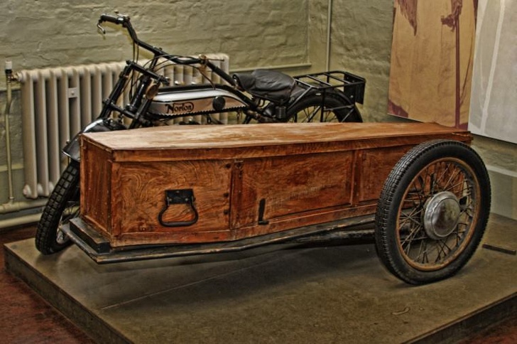 Un residente del condado de Norfolk conectó una plataforma de madera a la motocicleta Norton, a la cual colocó un ataúd vacío con fines ilustrativos. El hombre quería proporcionar una forma barata y rápida de trasladar los cuerpos de los fallecidos al lugar del entierro. Con el tiempo, otras empresas crearon motocicletas — coches fúnebres, pero este invento casero decidieron no utilizarlo, ya que fue considerado potencialmente inseguro.