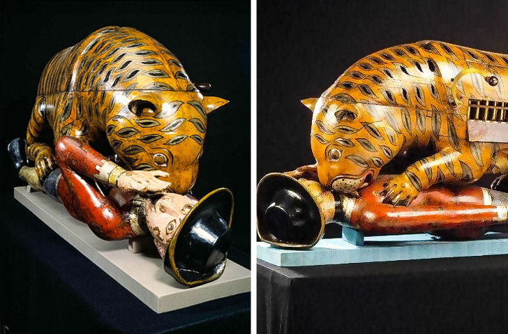El famoso juguete es un tigre que desgarra a un soldado británico. Las figuras son casi de tamaño real, y los mecanismos dentro de los cuerpos de madera imitan los sonidos de los gritos del hombre y el gruñido del tigre. El juguete fue hecho para el gobernante indio Tipu Sultan, que odiaba a los británicos con todo su corazón.