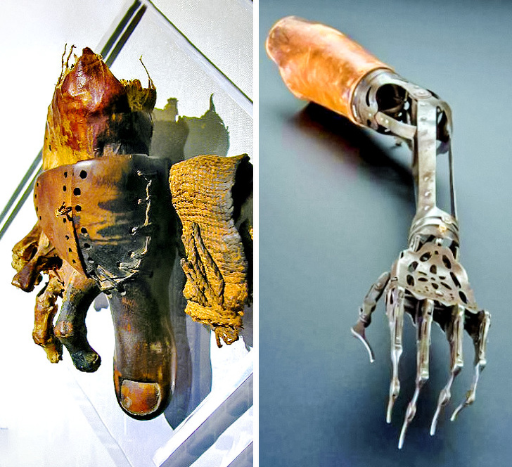 La prótesis se inventó incluso antes de Cristo. Por ejemplo, la primera fotografía muestra la prótesisde un egipcio antiguo del dedo gordo del pie, mientras que la segunda imagen muestra una prótesis de bronce realizada en la década de 1890.