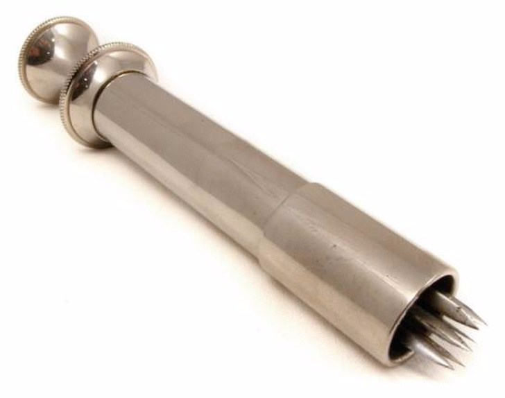 Este dispositivo no es un instrumento medieval de tortura, como puede parecer a primera vista. Fue inventado en 1840 para reducir el uso de sanguijuelas vivas. Una sanguijuela mecánica cortaba los tejidos de la superficie con cuchillas giratorias y chupaba sangre con un vacío que se formaba en el cilindro.