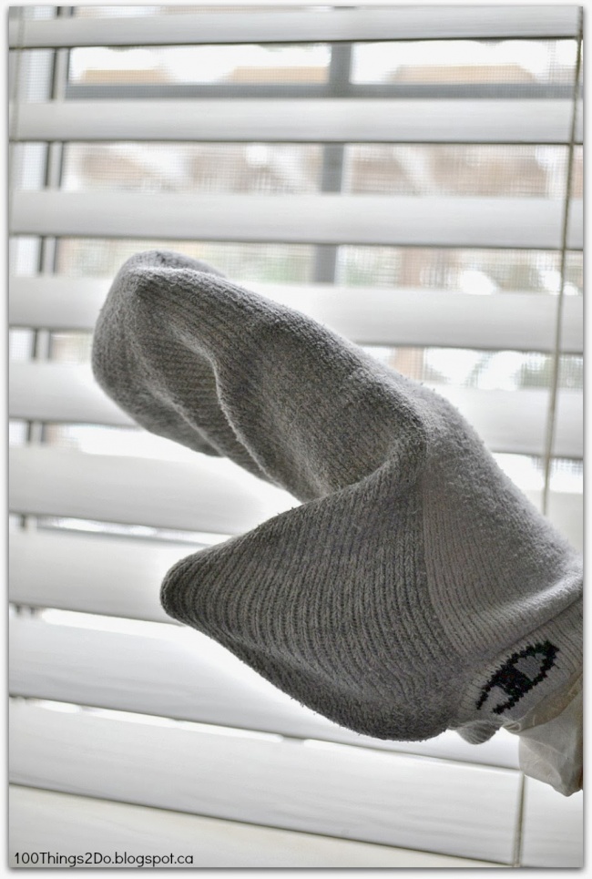 Para eliminar rapidamente o pó das persianas, use uma meia. Simplesmente coloque a meia na mão e ajuste da melhor maneira para enfiar os dedos entre as grades.