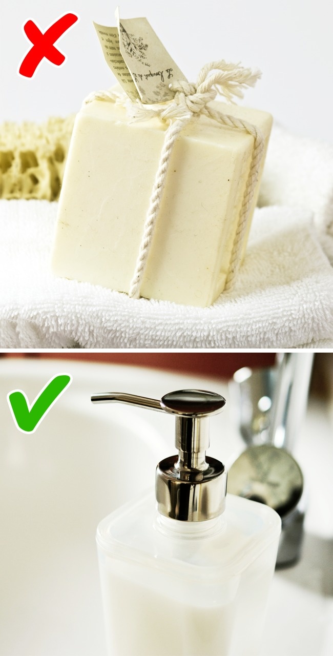 Siga este conselho e substitua o sabão normal por sabão líquido para lavar as mãos. O sabão normal costuma conter gordura e óleos e a espuma não é tão eficiente para limpar. Além disso, a espuma do sabão líquido não fica impregnada no rejunte do azulejo.
