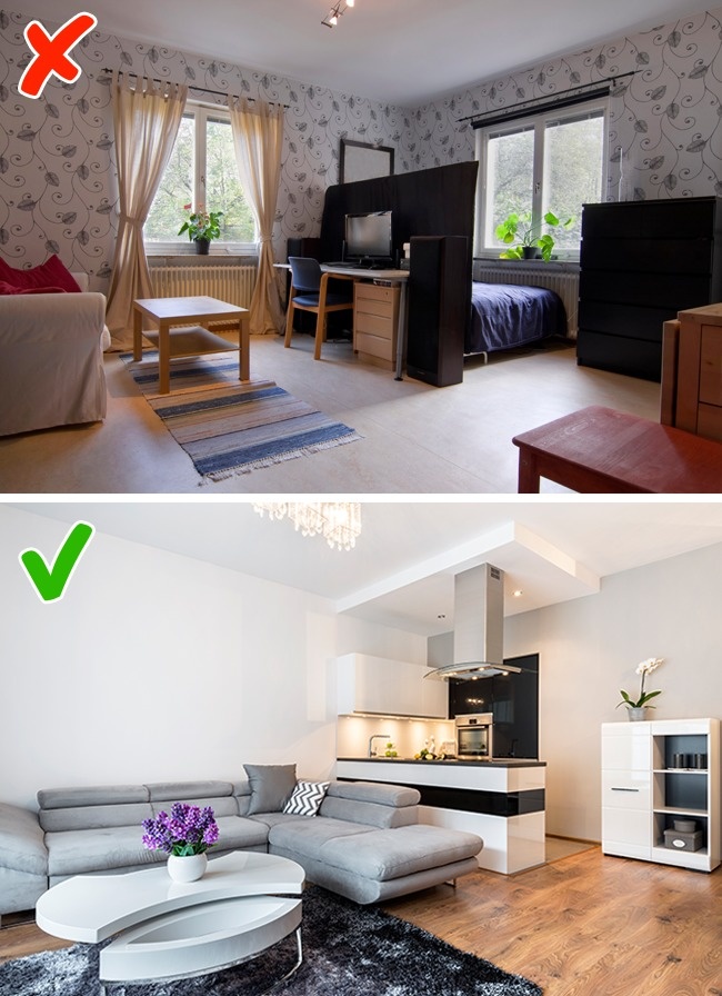 Ao escolher novos móveis, preste atenção na leveza. É importante que eles sejam transparentes, semitransparentes, claros e finos.