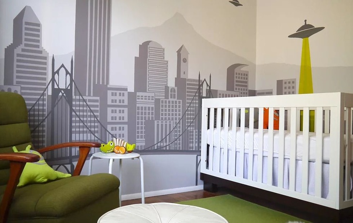 A pesar del mueble con formas clásicas, a primera vista todo está claro: ante nosotros hay una recámara infantil, y todo gracias a un extraordinario dibujo en la pared.