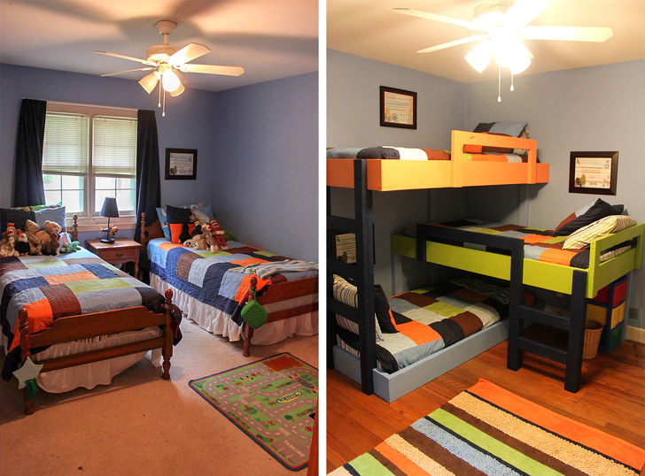 Una cama de tres niveles en lugar de tres camas simples, normalmente, no solo te permite liberar el espacio para jugar, sino también hace una recámara verdaderamente a la moda.