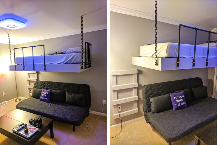 Tal minimalismo probablemente le gustará a cualquier adolescente, ya que en esta recámara no sobra nada, y la cama será como si volara en el aire.