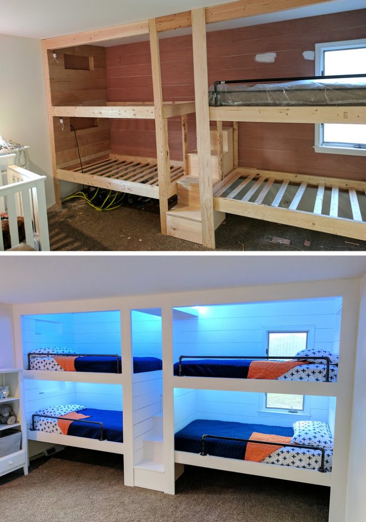 Es difícil hacer tal cama con tus propias manos, pero el resultado vale la pena, ya que cada niño comienza a tener su propio espacio.