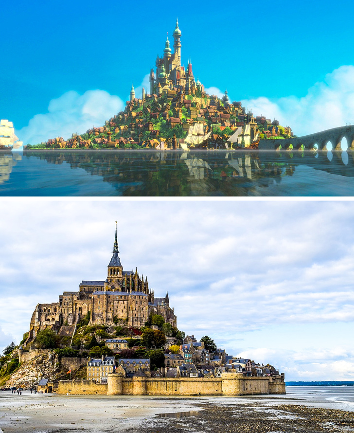 En Normandía, Francia, está el palacio de Monte Saint-Michel, el cual sirvió como guía para dibujar el castillo de la princesa de la película “Enredados”.