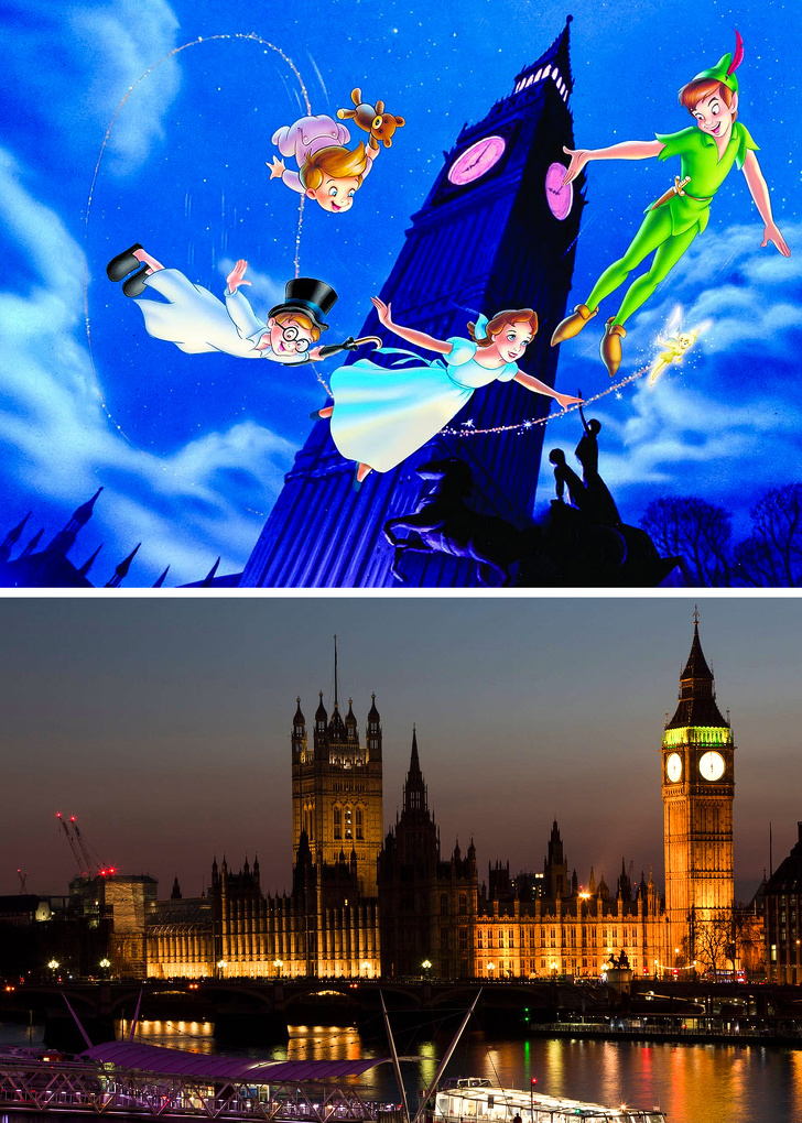 Las aventuras de Peter Pan y Wendy transcurren en la ciudad de Londres, Inglaterra. En una escena, mientras utilizan polvo de hadas, vuelan por la urbe y se puede apreciar el Big Ben.