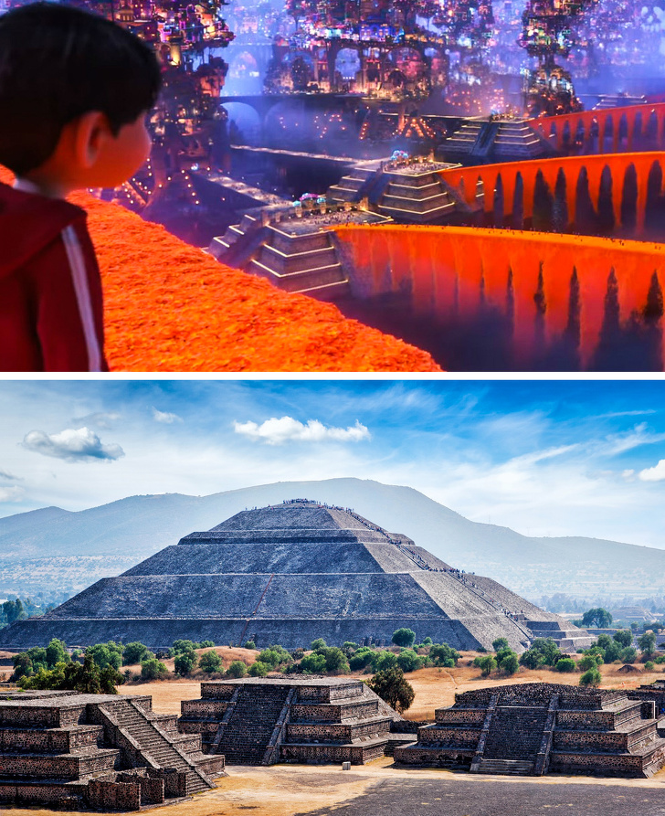Coco es una de las películas que muestra más lugares, monumentos, locaciones y estructuras reales de un país. Toda la arquitectura de México sirvió para dar vida a la cinta que relata una tradición propia del suelo azteca. Como ejemplo de ello, encontramos una escena en el mundo de los muertos que presenta construcciones similares al complejo arqueológico de Teotihuacán.