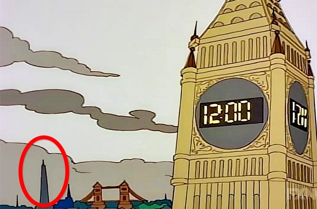 Durante el viaje de Lisa a Londres (Temporada 6, Capítulo 19, 1995) nos enseñan un rascacielos detrás del Puente de la Torre, que se parece mucho al rascacielos “The Shard” e incluso se ubica en el mismo lugar. La construcción de la torre empezó 14 años después de la predicción.