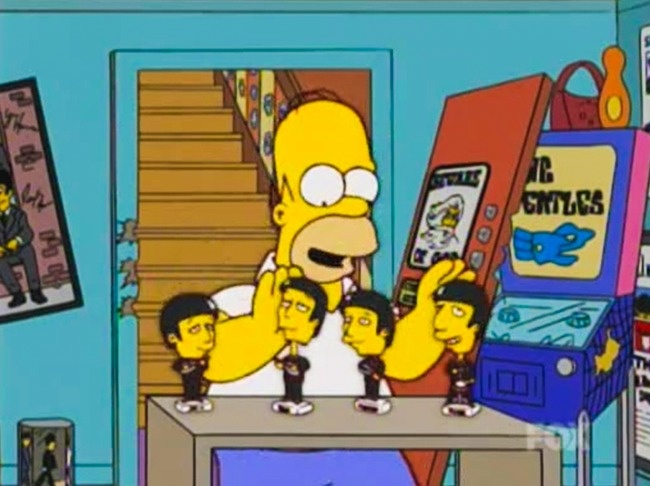 La serie y los músicos se simpatizan. Tres miembros de la banda han participado en el show: George Harrison, Ringo Starr y Paul McCartney. John Lennon murió mucho antes de que empezara la serie, pero su canción “Mother“ sonó en uno de los episodios. De esta manera, en ”Los Simpson” salieron las cuatro voces de la famosa agrupación musical.