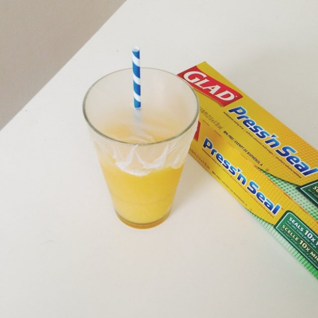 Cover a glass filled with liquid with some food wrap and pierce it with a straw to make the ideal no-spill cup — one that will be perfect if you need to drink when exercising, for example. Seriously — there’s no way you can spill anything with this method!