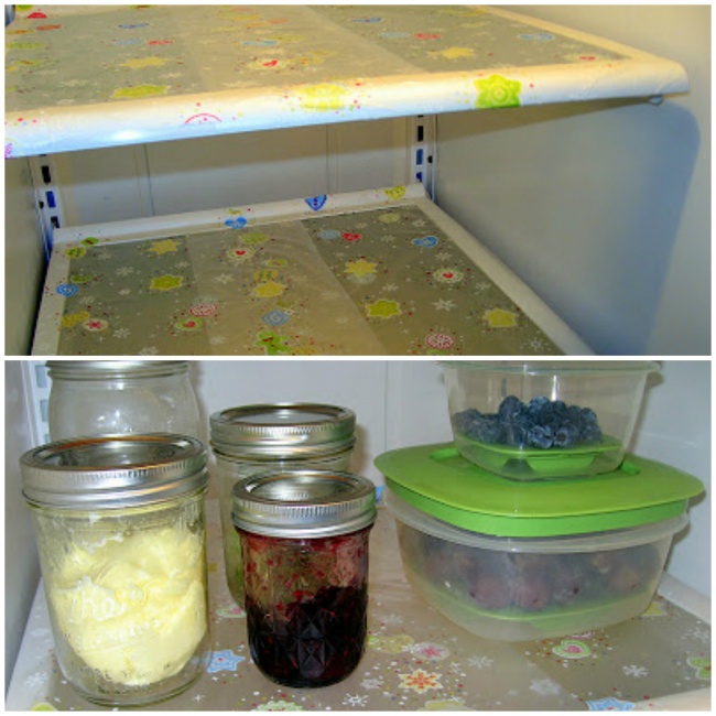 Cover the shelves of your refrigerator with plastic food wrap and keeping it clean will be a whole lot easier. Even if, say, an egg gets smashed and spills everywhere, all you need to do is remove the piece of food wrap and replace it with another one.