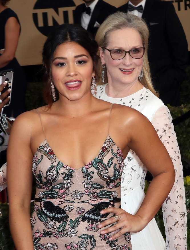 8. Meryl Streep no pudo evitar posar mientras pasaba por detrás de su colega, Gina Rodríguez, en la alfombra roja de los premios de los guionistas de Hollywood… casi ni se percató del momento