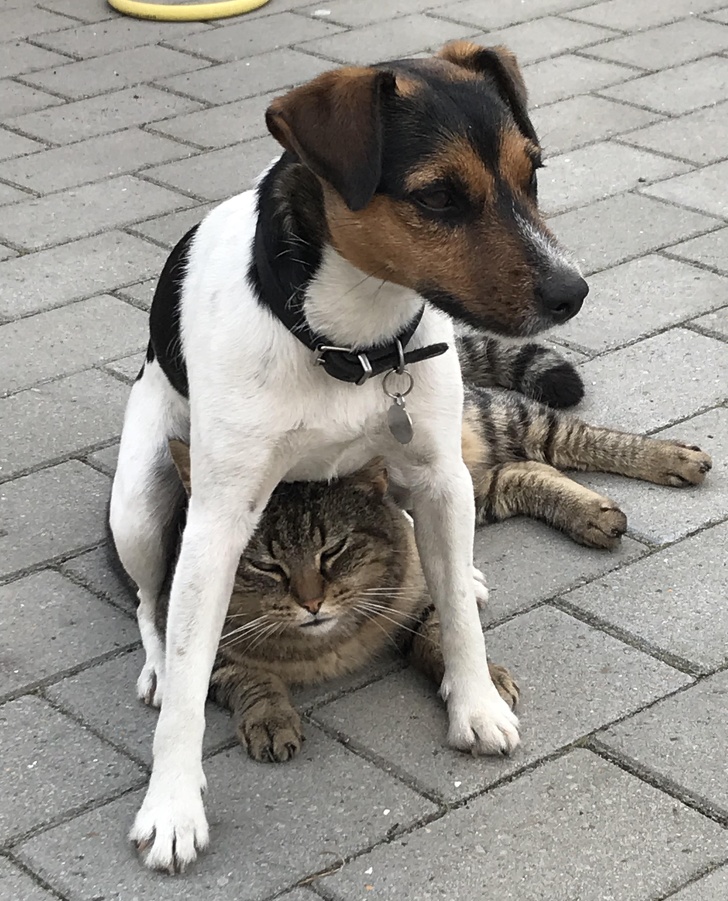 6. “Este perro tiene toda una granja a su disposición, puede sentarse donde quiera, pero su lugar favorito es el gato”